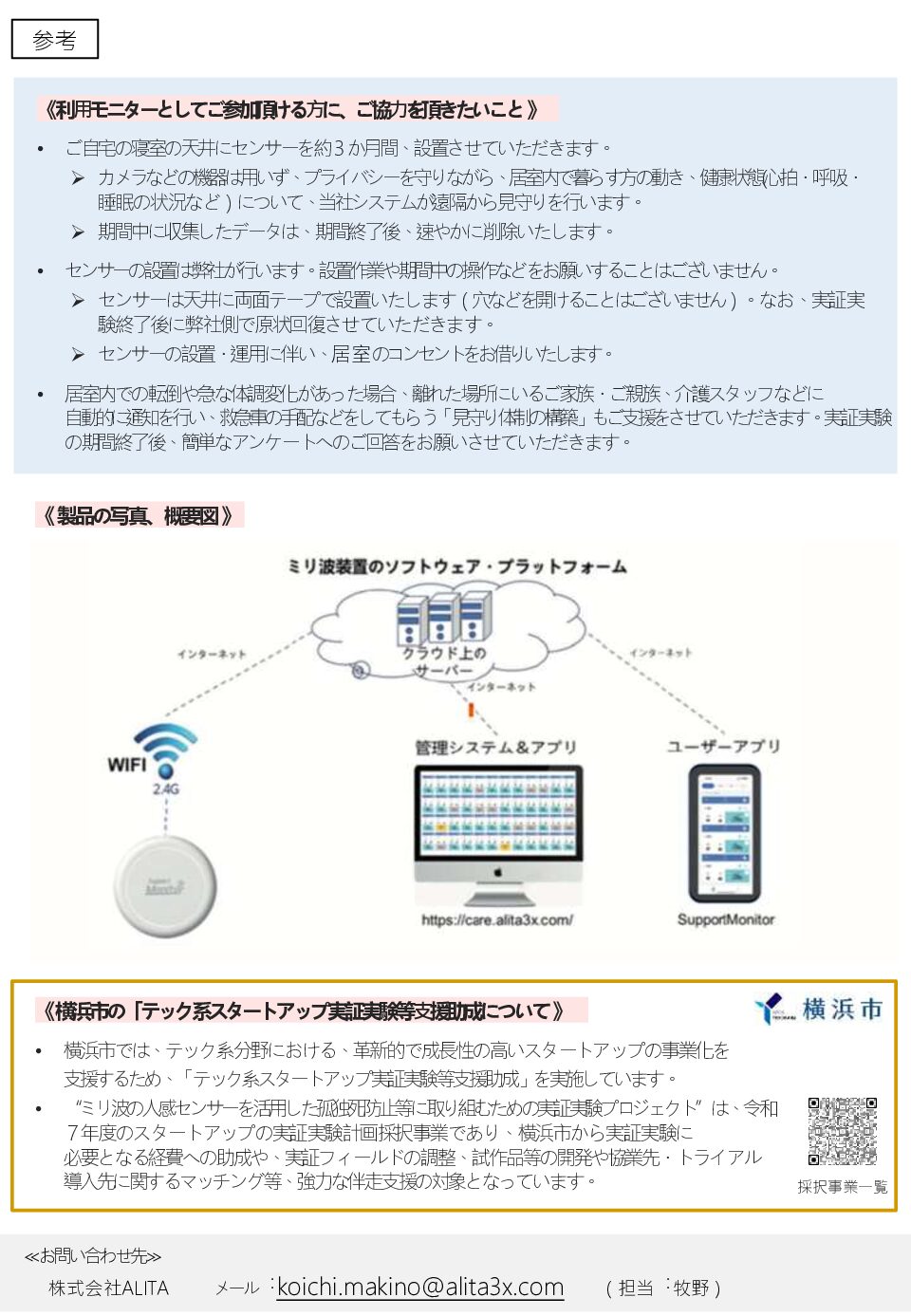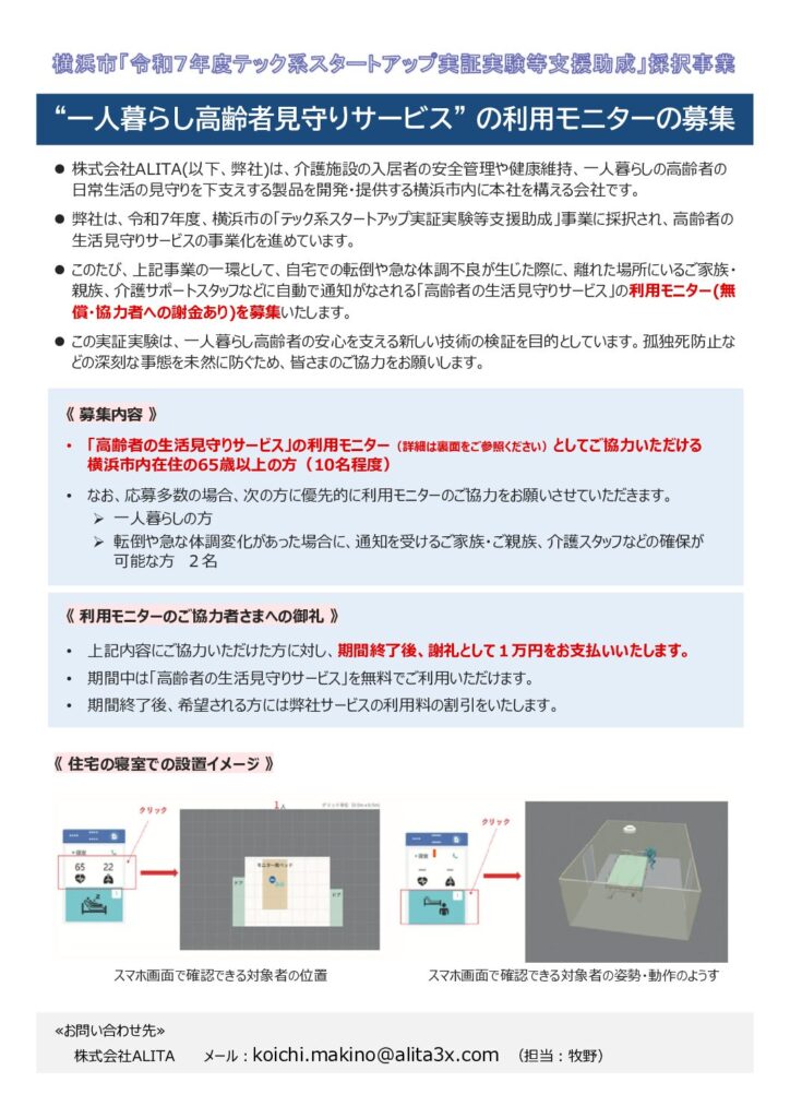 「一人暮らし高齢者見守りサービスのモニター募集」 (10名募集、謝礼1万円)投稿者:alita-rebecca投稿公開日:2025年10月19日投稿カテゴリー:お知らせ / 未分類(10名募集、謝礼1万円)募集チラシ参照 おすすめ ALITAとiTECが高齢者向け熱中症警告ソリューションを発表 2025年8月18日 3月4日、かながわ福祉サービス振興会が主催する介護ロボット・ICT機器の展示会「介護・生活ロボットフォーラム」に出展しました。 2024年3月4日 ※夜間巡回負担を軽減する新しいモニタリングインターフェースをリリース(さらに見やすく便利に改良) 2024年7月25日