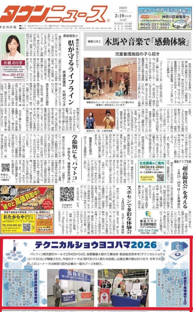 タウンニュースに掲載されました。2026年2月19日号投稿者:alita-rebecca投稿公開日:2026年2月23日投稿カテゴリー:お知らせ / 事例紹介 / 未分類 おすすめ 3月4日、かながわ福祉サービス振興会が主催する介護ロボット・ICT機器の展示会「介護・生活ロボットフォーラム」に出展しました。 2024年3月4日 ※夜間巡回負担を軽減する新しいモニタリングインターフェースをリリース(さらに見やすく便利に改良) 2024年7月25日 ※介護老人保健施設ラ・クラルテ(横浜市神奈川区)に50台設置(補助金導入4/5)見学可能 2025年3月14日