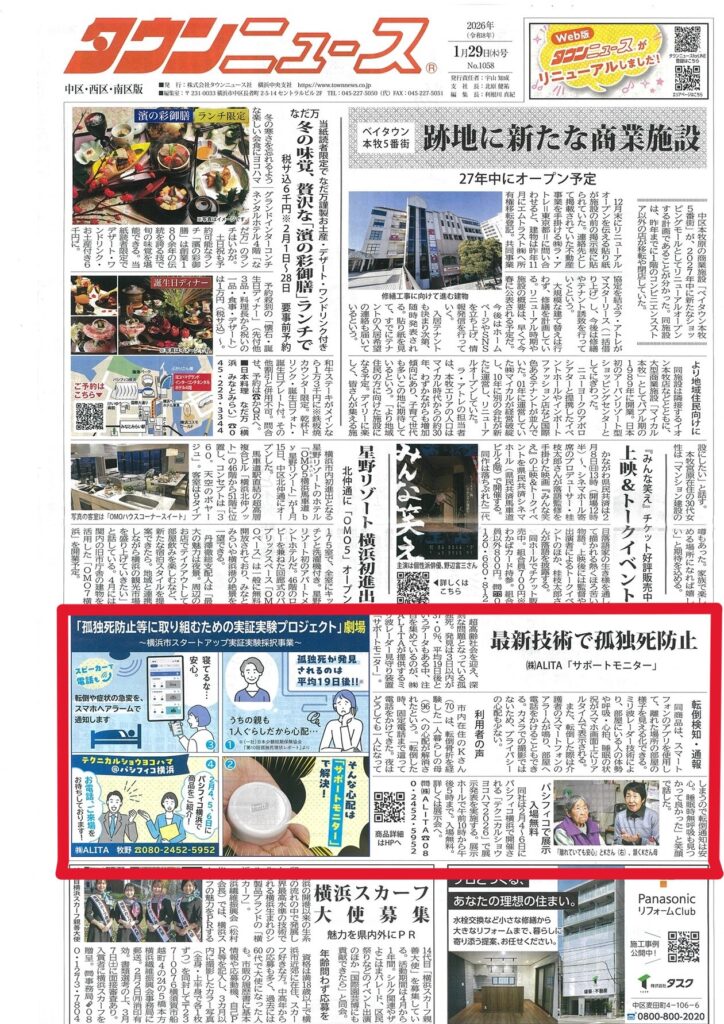 タウンニュースに掲載されました投稿者:alita-rebecca投稿公開日:2026年2月1日投稿カテゴリー:お知らせ / 事例紹介 / 未分類 おすすめ テクニカルショウヨコハマ2026に出展します 2026年2月1日 ※3月6日介護・生活ロボットフォーラム展示会に出展 2025年3月14日 7月25日横浜市の「テック系スタートアップ実証実験等支援助成」に採択されました。(孤独死防止等プロジェクト) 2025年7月26日